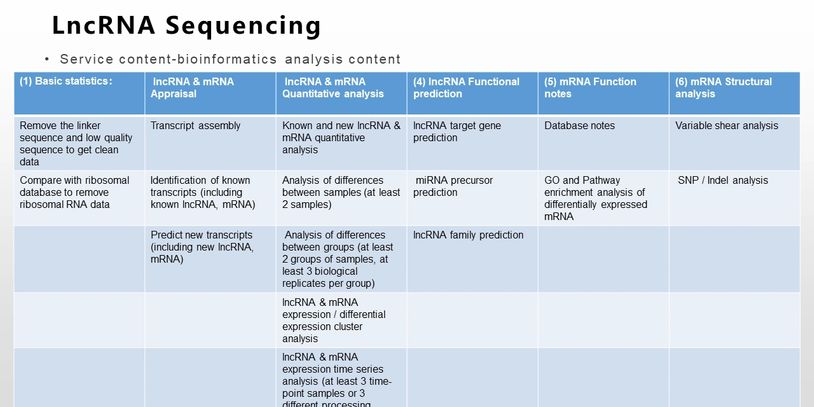 LncRNA High-throughput sequencing, using a ribosome chain-specific library construction method, Non-coding for long chains RNA mRNA large RNAs such as circular RNA for sequencing research, In order to quickly and comprehensively obtain all large RNA transcript data information for specific biological processes (such as development, disease, etc.).